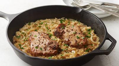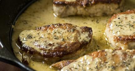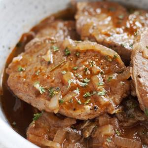 Lower the heat under the pan to low-medium heat. Return the pork to the pan and season with salt and pepper. Partially cover with a lid and cook for about 1 1/2 hours (probably less if you're using pork tenderloins), flipping the pork and scraping the bottom of the pan every 20 minutes or so. Keep an eye on it, making sure there continues to be some liquid in the pan. Add 1/4 cup of warm water if necessary.