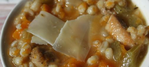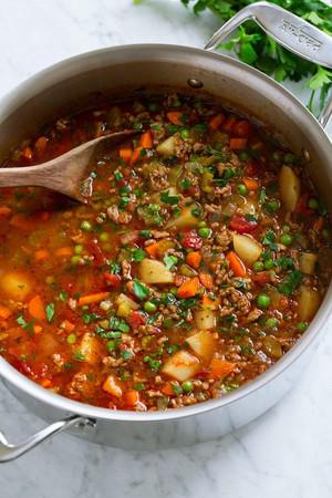 In a large skillet, cook beef and onion over medium heat until meat is no longer pink. Add garlic; cook 1 minute longer. Drain. Add the broth, tomato sauce and water; bring to a boil. Stir in the remaining ingredients. Reduce heat; cover and simmer until barley is tender, 45-50 minutes.