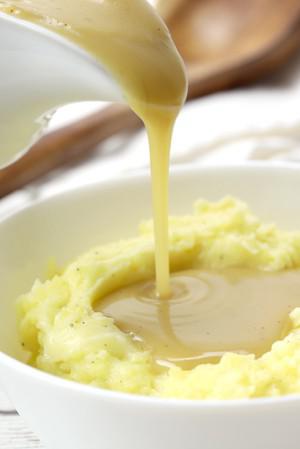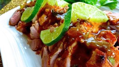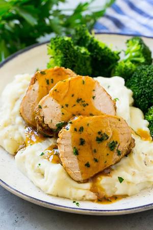 When the sauce is ready, slice the pork very thinly and place on to a serving platter. Pour the warm gravy over-top to serve.
