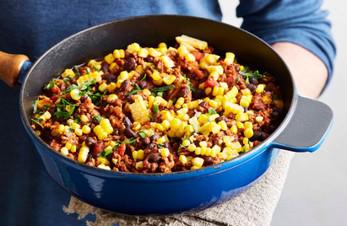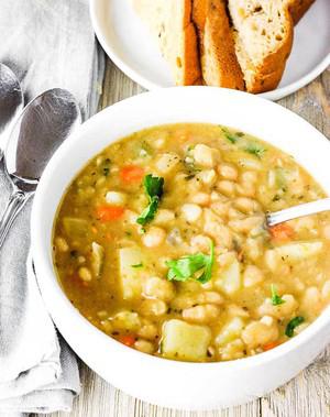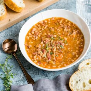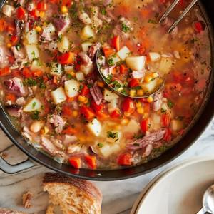 Stir in ham stock, beans, corn, thyme/marjoram, rosemary, and bay leaves; season with salt and pepper, to taste.