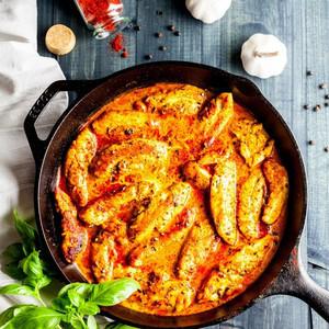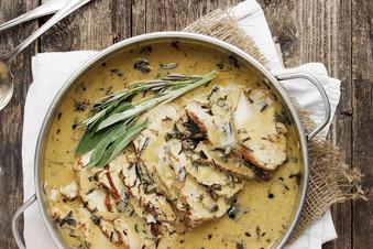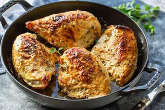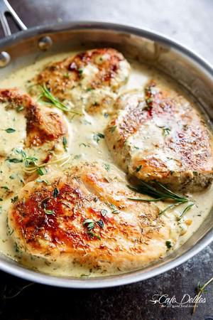 Meanwhile, increase the heat under the liquid in the pan to medium. If your pan has little liquid, deglaze with a splash of white wine. Stir well to loosen the browned bits on the bottom of the pan. Allow to cook until the alcohol smell disappears (about 1-2 minutes). Add the chicken stock and stir to combine. Heat over medium heat a few minutes, to allow the chicken stock to heat through a bit. Reduce heat to medium-low. Add the cream. Heat gently over medium-low heat, stirring the sauce constantly, until it thickens a bit and is warmed through. Avoid vigorously boiling. A gentle simmer is fine. (*If your sauce doesn't thicken up, mix 2 Tbsp. cornstarch with 2 Tbsp. water and add a bit at a time to your sauce until it thickens to your liking.) Taste sauce and add salt and freshly ground pepper, to taste.