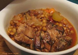 In a large nonstick skillet brown pork, onion, and garlic in hot oil.